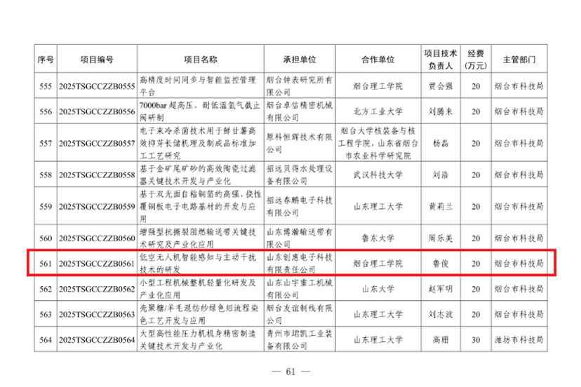 近日,从省科技厅获悉,由太阳成集团tyc234cc与山东创惠电子科技有限责任公司联合申报的“低空无人机智能感知与主动干扰技术的研发”项目,经过专家评审,成功获批2025年度省级科研计划“山东省科技型中小企业创新能力提升工程”立项。该项目的成功立项标志着公司在校企深度融合、产学研一体发展方向取得重要成果。
