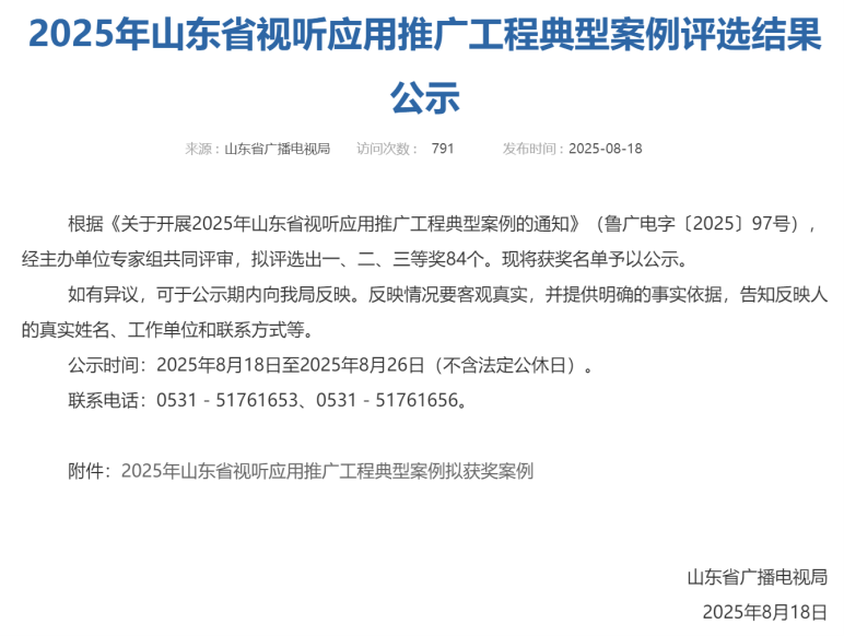 山东省视听应用推广工程由省主管部门组织实施,旨在挖掘并推广一批利用视听新技术赋能千行百业的创新案例,助力经济社会数字化、智能化发展。本届评选竞争激烈,涵盖文化旅游、数字家庭、教育培训、医疗健康、智慧交通等多个领域,公司项目能在“视听+医疗健康”这一重要方向上获此殊荣,实属不易。