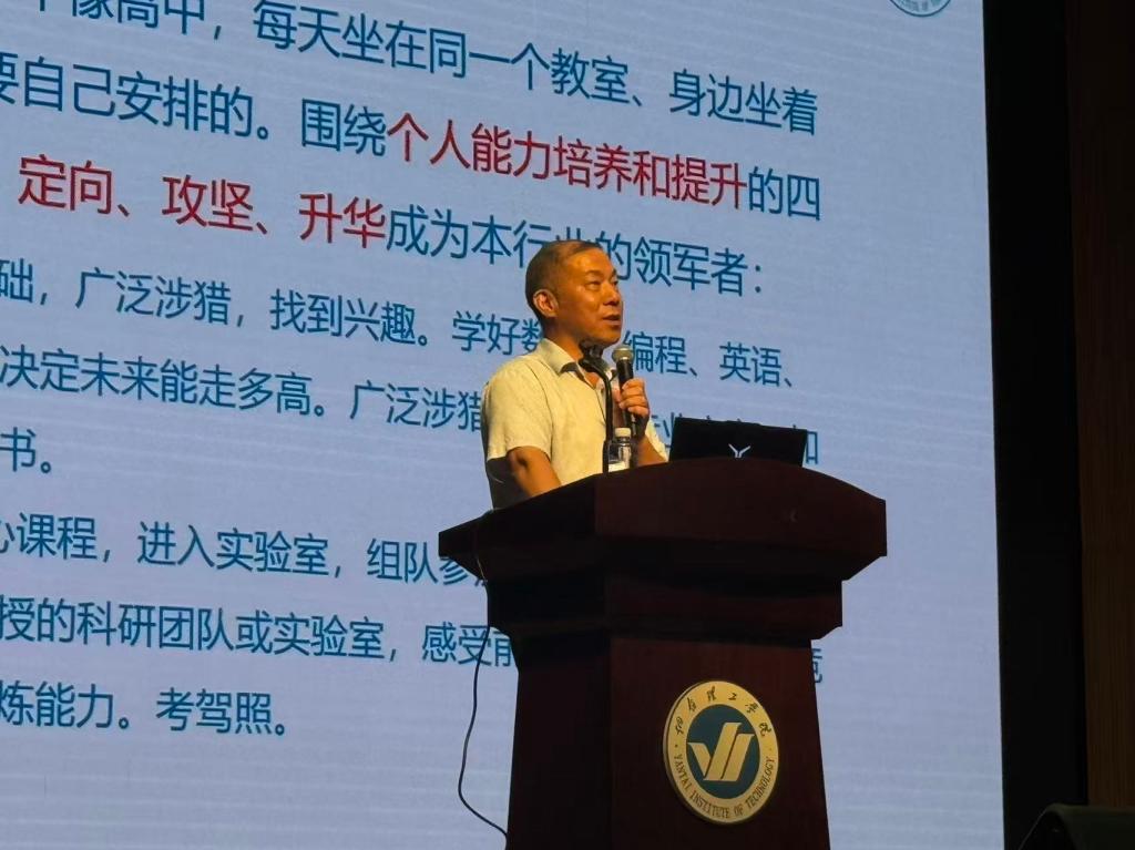 课堂上,糜经理首先对2025级新生的到来表示热烈欢迎,并从人工智能的发展历程讲起,深入浅出地阐述了这一领域从萌芽到如今飞速发展的过程并着重提出“新质生产力”、“低空经济”等名词,他指出,当下我们正处于一个被人工智能深刻变革的时代,从日常到各行业的自动化生产、智能医疗诊断等,人工智能已经渗透到生活的方方面面,甚至洞察未来,成为推动社会进步的重要力量。